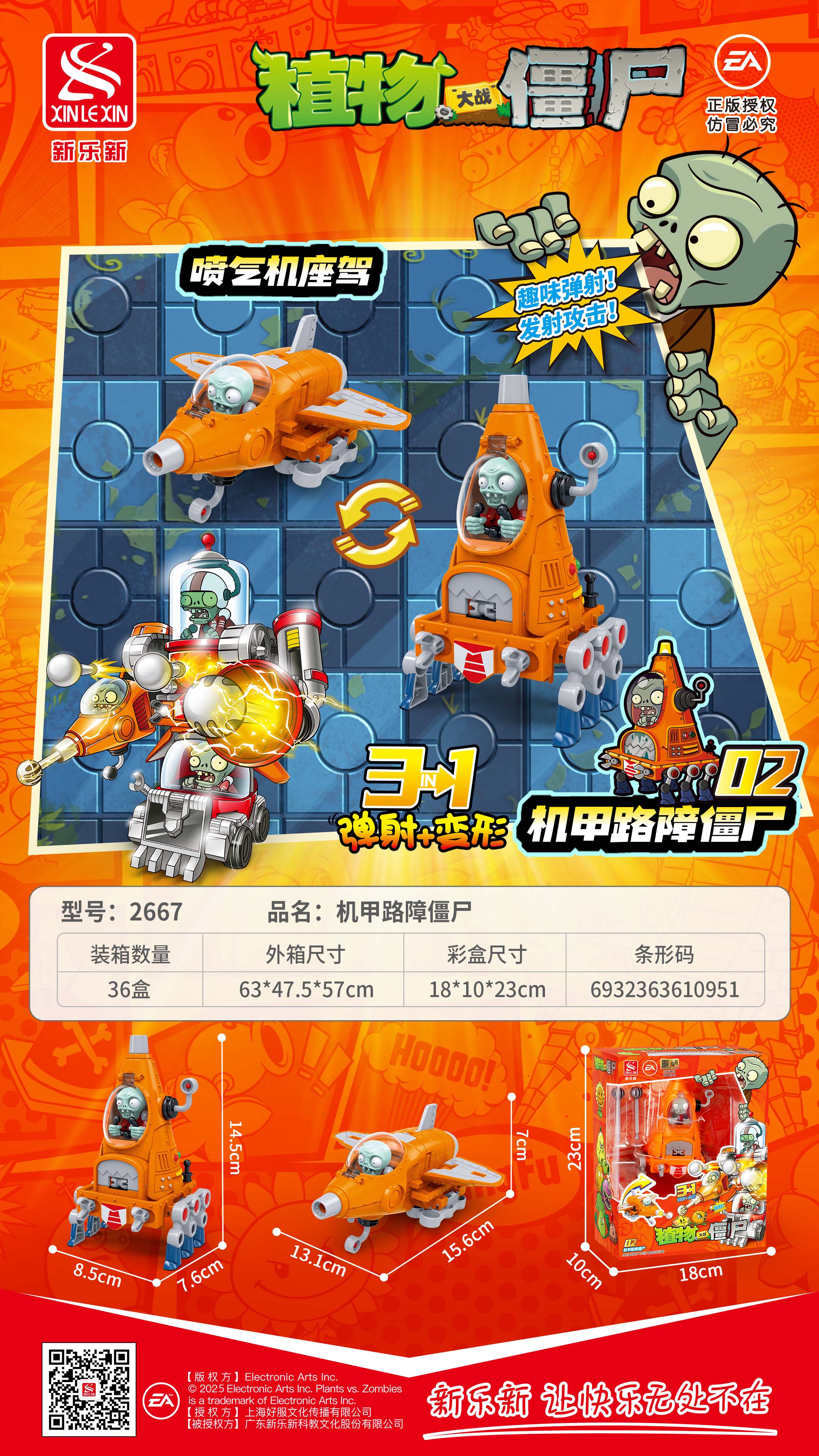 產(chǎn)品規(guī)格:機甲路障僵尸:8.5*7.6*14.5,噴氣機座駕:13.1*15.6*7
